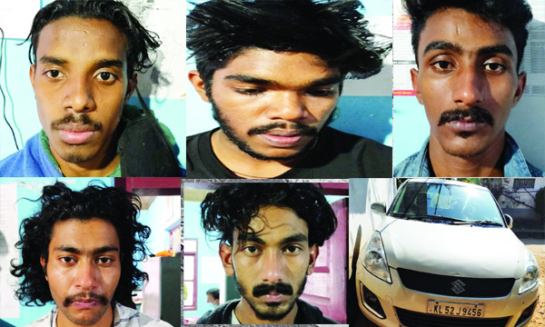 മലപ്പുറം തിരൂര് വളാഞ്ചേരി കരയില് താമസക്കാരായ മേലേപ്പീടികയില് വീട്ടില് മുഹമ്മദ് അസ്ലം (23), പറശേരി വീട്ടില് മുഹമ്മദ് സുെഹെല് (20), പാറമേല്ത്തൊടി വീട്ടില് സൂരജ് (23), കഴപ്പനങ്ങാട്ട് പറമ്പില് വീട്ടില് ബിബിന് (21), തയ്യില് വീട്ടില് മുഹമ്മദ് അസ്കര് (20) എന്നിവരെയാണ് മയക്കുമരുന്നുമായി അറസ്റ്റ് ചെയ്തത്.
