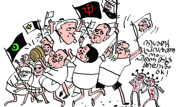 സംസ്ഥാനത്തു പ്രതിദിന കോവിഡ് രോഗികളുടെ എണ്ണം വീണ്ടും മൂവായിരത്തിലേക്ക് അടുക്കുകയാണ്. പലയിടത്തും സ്ഥാനാര്ഥികള്ക്കടക്കം കോവിഡ് ബാധിച്ചതോടെയാണ് ആരോഗ്യവകുപ്പിന്റെ അഭ്യര്ഥന മാനിച്ച് തെരഞ്ഞെടുപ്പു കമ്മിഷന് പ്രചാരണത്തിനൊടുവിലെ കൊട്ടിക്കലാശം വിലക്കിയത്. പ്രതിരോധ മാനദണ്ഡങ്ങള് പാലിക്കാത്തവര്ക്കെതിരേ കര്ശന നടപടിയെടുക്കണമെന്ന് പോലീസിനോട് ആരോഗ്യ വകുപ്പ് ശിപാര്ശ ചെയ്തിരുന്നു. മാസ്കുകള് പോലും ഊരിയെറിഞ്ഞ് മിക്കാവാറും എല്ലായിടത്തും സ്ഥാനാര്ഥികളടക്കം ജനസമുദ്രം സൃഷ്ടിച്ചു. മുന്കരുതലുകള് പരസ്യമായി ലംഘിക്കുന്നതു ചൂണ്ടിക്കാട്ടി ആരോഗ്യവകുപ്പ് ഡി.ജി.പിയെ വിവരങ്ങള് ധരിപ്പിച്ചെങ്കിലും നടപടിയുണ്ടായില്ല. കേസെടുക്കാതെയും പിഴയിടാതെയും പോലീസ് എല്ലാം കണ്ടുനിന്നു.