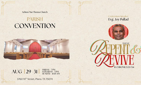 പ്ലാനോ(ഡാലസ്) : സെഹിയോൻ മാർത്തോമ ചർച്ച് പാരിഷ് കൺവെൻഷൻ ഓഗസ്റ്റ് 29 മുതൽ 31 വരെ നടത്തപ്പെടുന്നു ഇവാഞ്ചലിസ്റ്റ് ജോയ് പുല്ലാട് കൺവെൻഷനിൽ മുഖ്യാതിഥിയായി പങ്കെടുത്ത് വചന ശുശ്രൂഷ നിർവഹിക്കും
