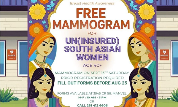 കൂടുതൽ വിവരങ്ങൾക്ക് 281 402 6585 എന്ന നമ്പറിൽബന്ധപ്പെടാവുന്നതാണ്. മാമ്മോഗ്രാമിന് മുൻകൂട്ടിയുള്ള രെജിസ്ട്രേഷൻ ആവശ്യമാണ് - നമ്പർ 281 412 6606.