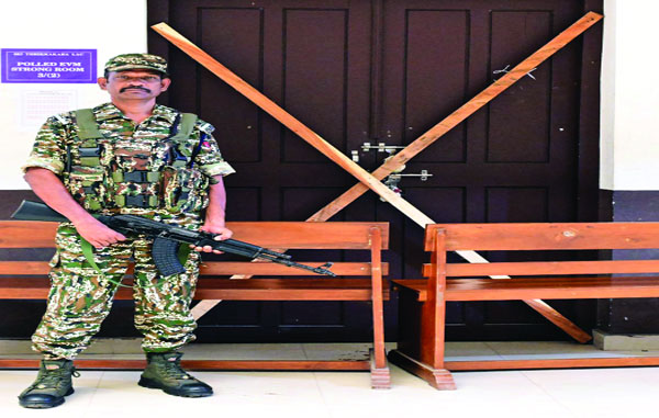 ഇലക്രേ്ടാണിക് വോട്ടിങ് മെഷീനുകള് സൂക്ഷിച്ചിരിക്കുന്ന കളമശ്ശേരി കുസാറ്റിലെ സ്ട്രോങ്ങ് റൂമിന് കാവല് നില്ക്കുന്ന സായുധ സേനാംഗം.